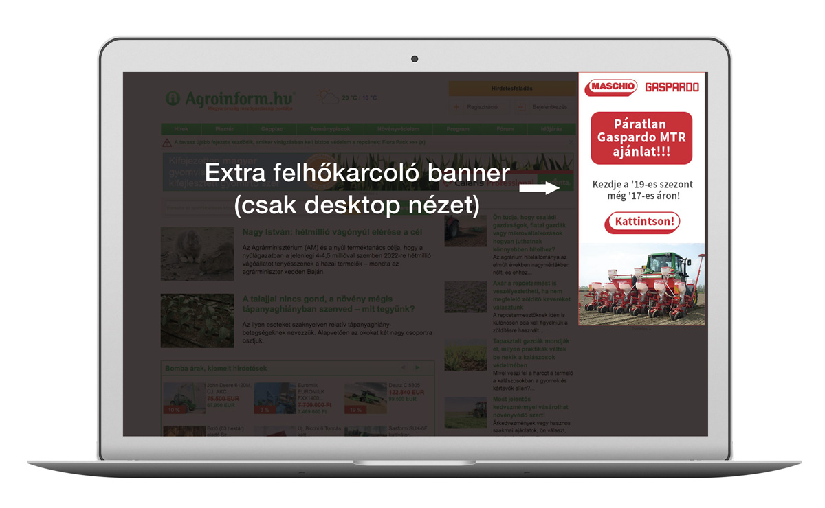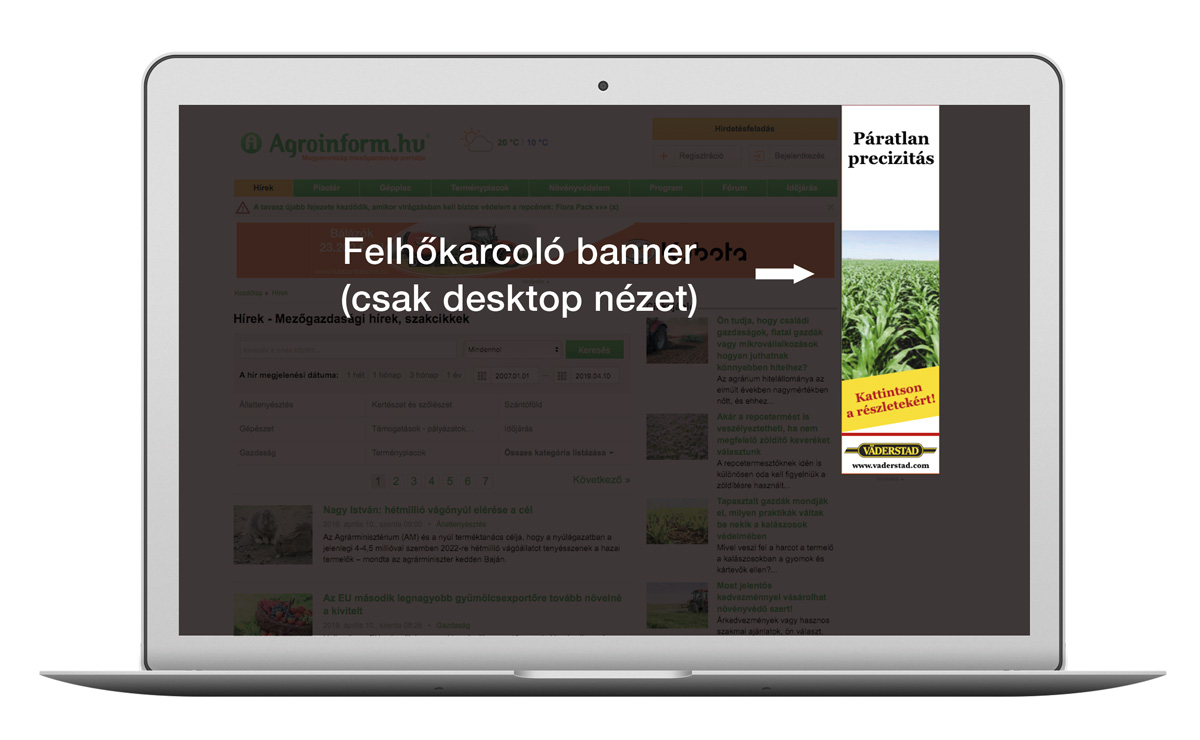- AV alapon történő megjelenés a portál aloldalain váltakozva más hirdetésekkel a site jobb oldalán követve a képernyő mozgását (Desktop)